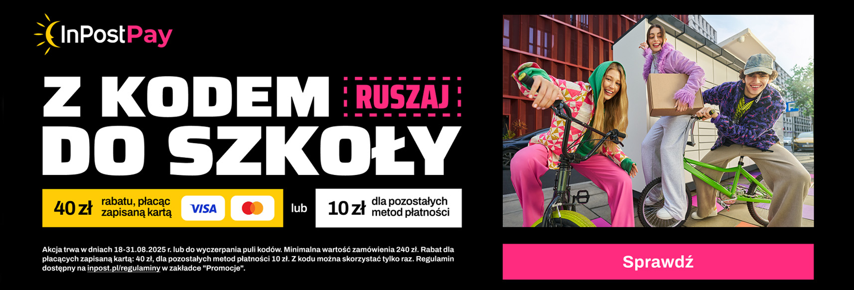 Kupując z InPost Pay w dniach 18–31 sierpnia 2025 r., z kodem RUSZAJ możesz zyskać do 40 zł rabatu na zakupy powyżej 240 zł. To idealna okazja, by wejść w nowy rok szkolny z oszczędnościami.